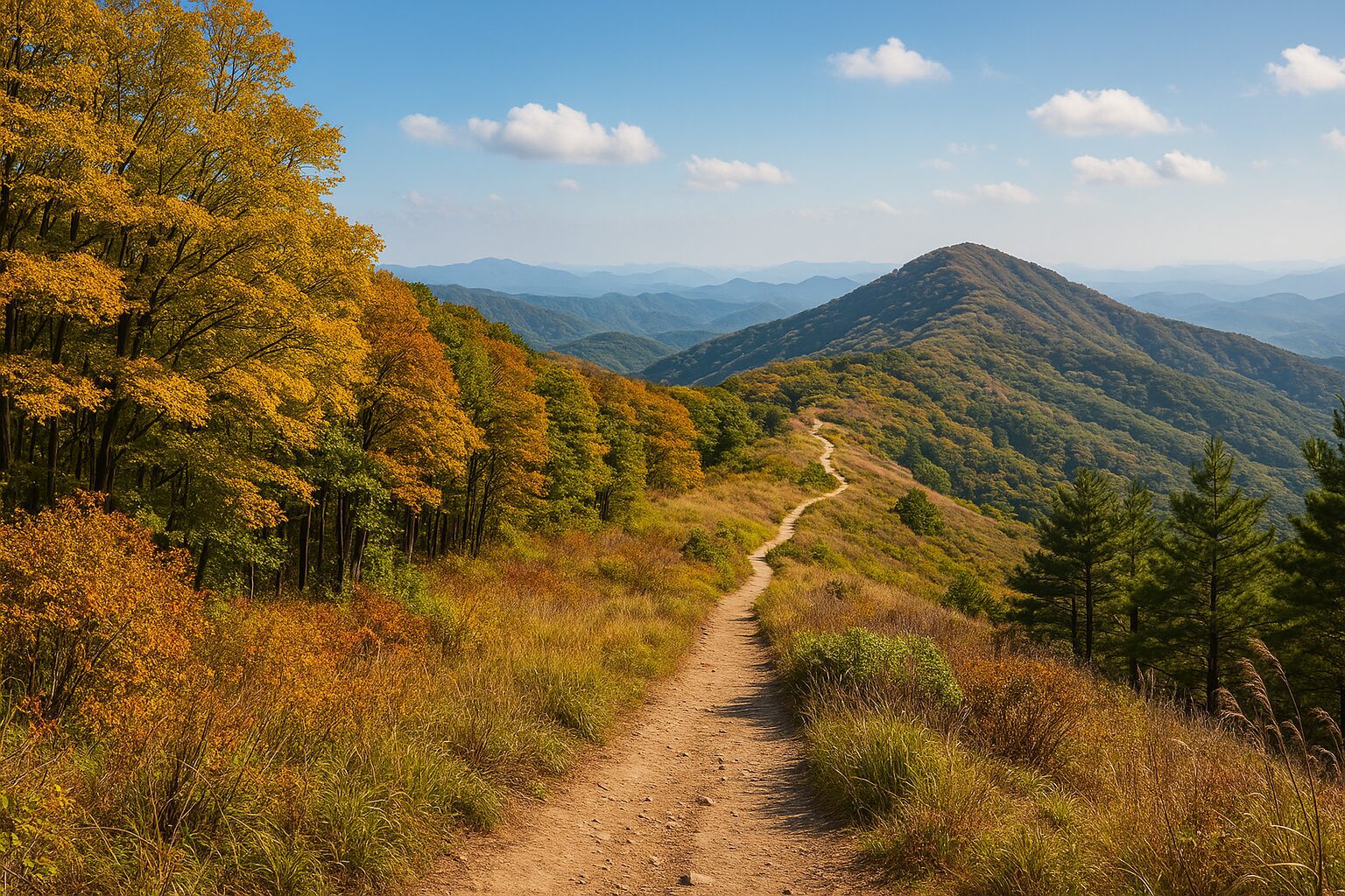 - 평화로운 능선을 따라 이어지는 등산로