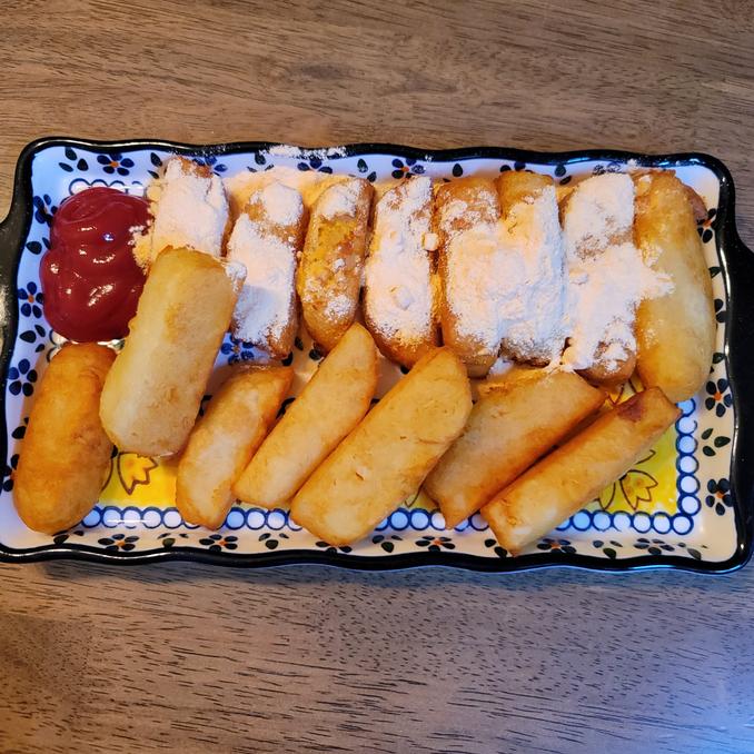 감자를 통째로 튀기는 대신, 찐 감자를 으깨어 반죽해서 튀긴 감자스틱을 소개할게요.